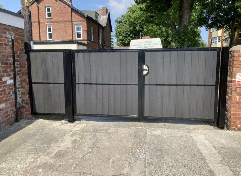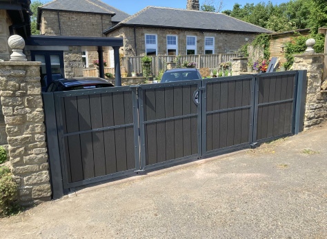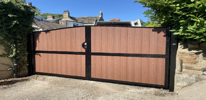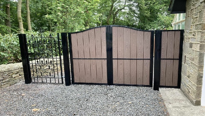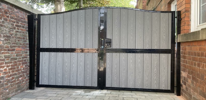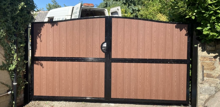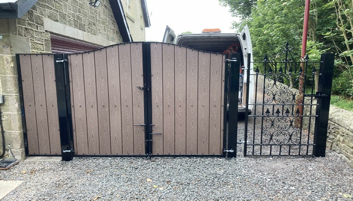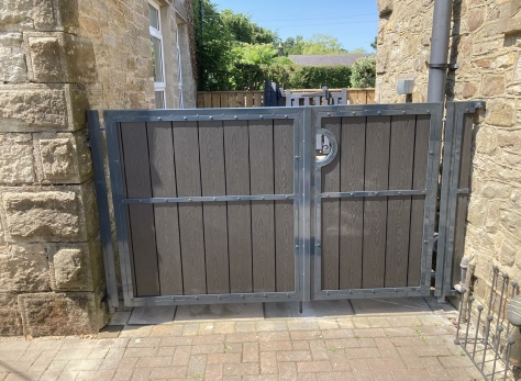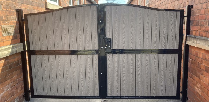 BROWN COMPOSITE CLAD GATES AND CUSTOMERS OLD IRON GATE BLASTED & POWDER COATED