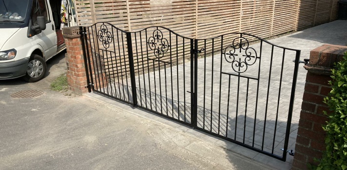 A SIMPLE ROSETTE DESIGN BI-FOLDING SET OF DRIVE GATES INSTALLED, GALVANISED FOR RUST PROTECTION POWDER COATED FINISH